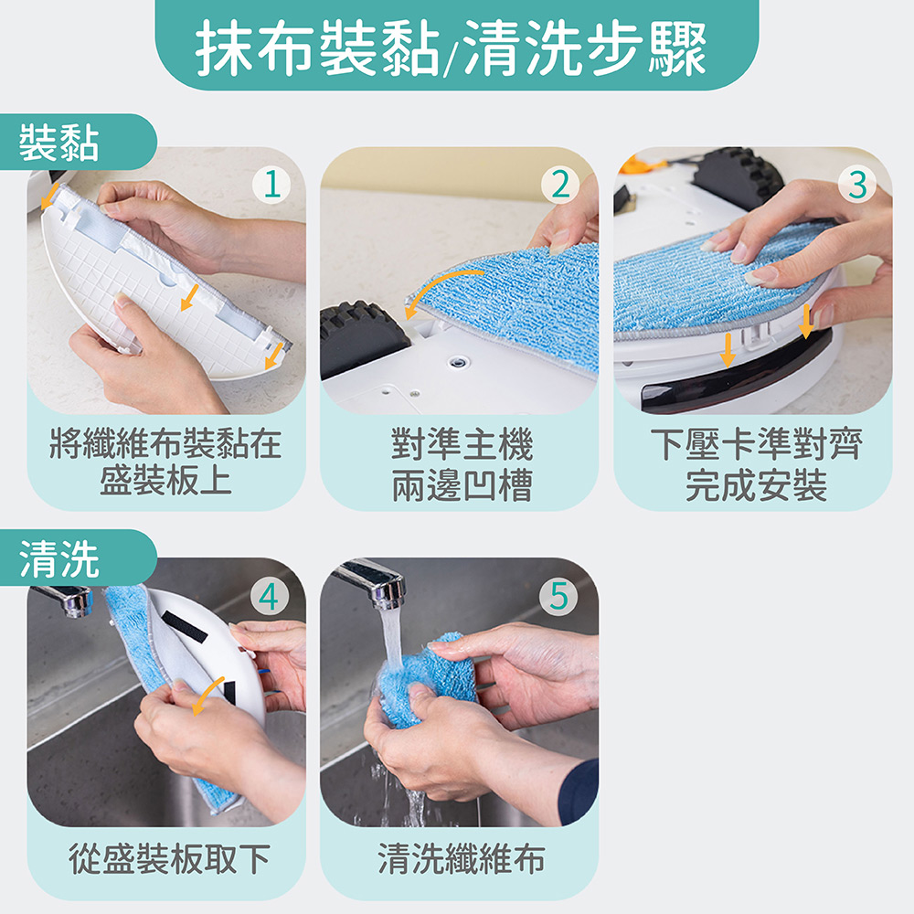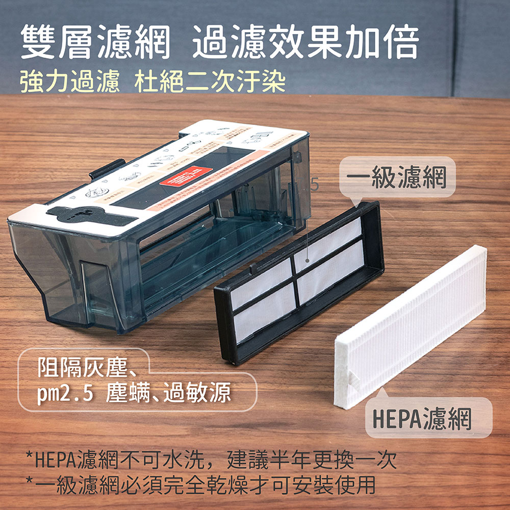 說明書x1、HEPA濾網x1、邊刷1組、拖地布x1