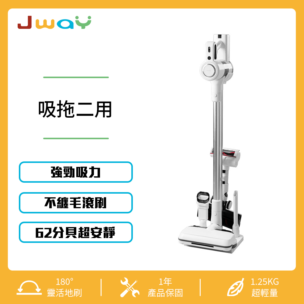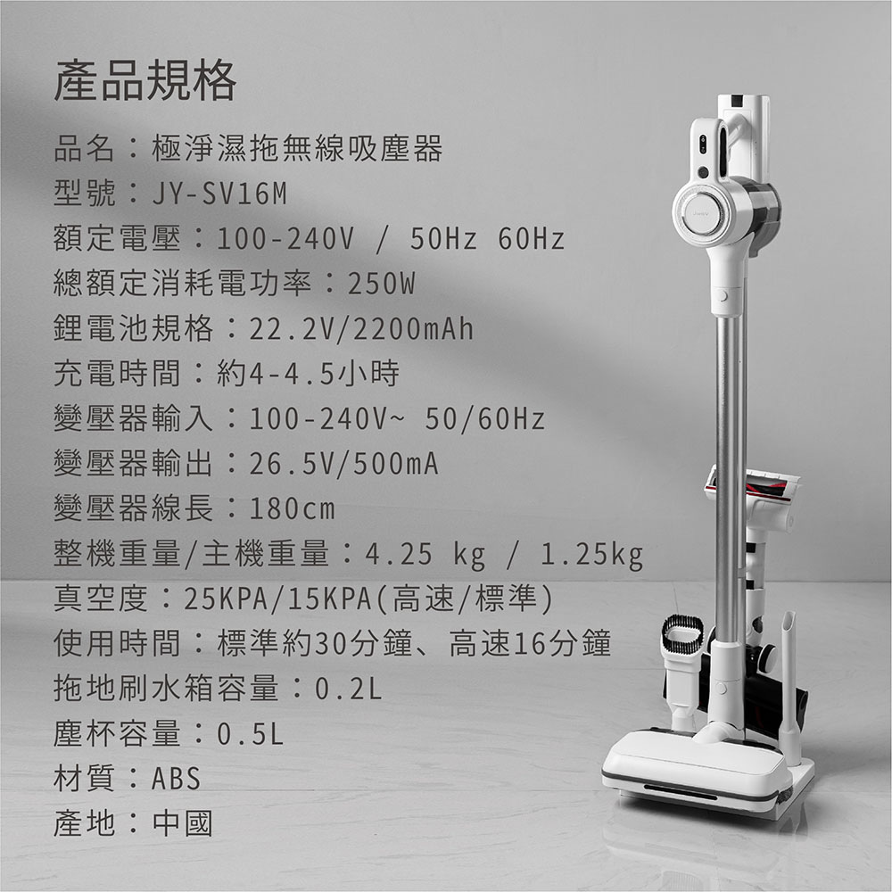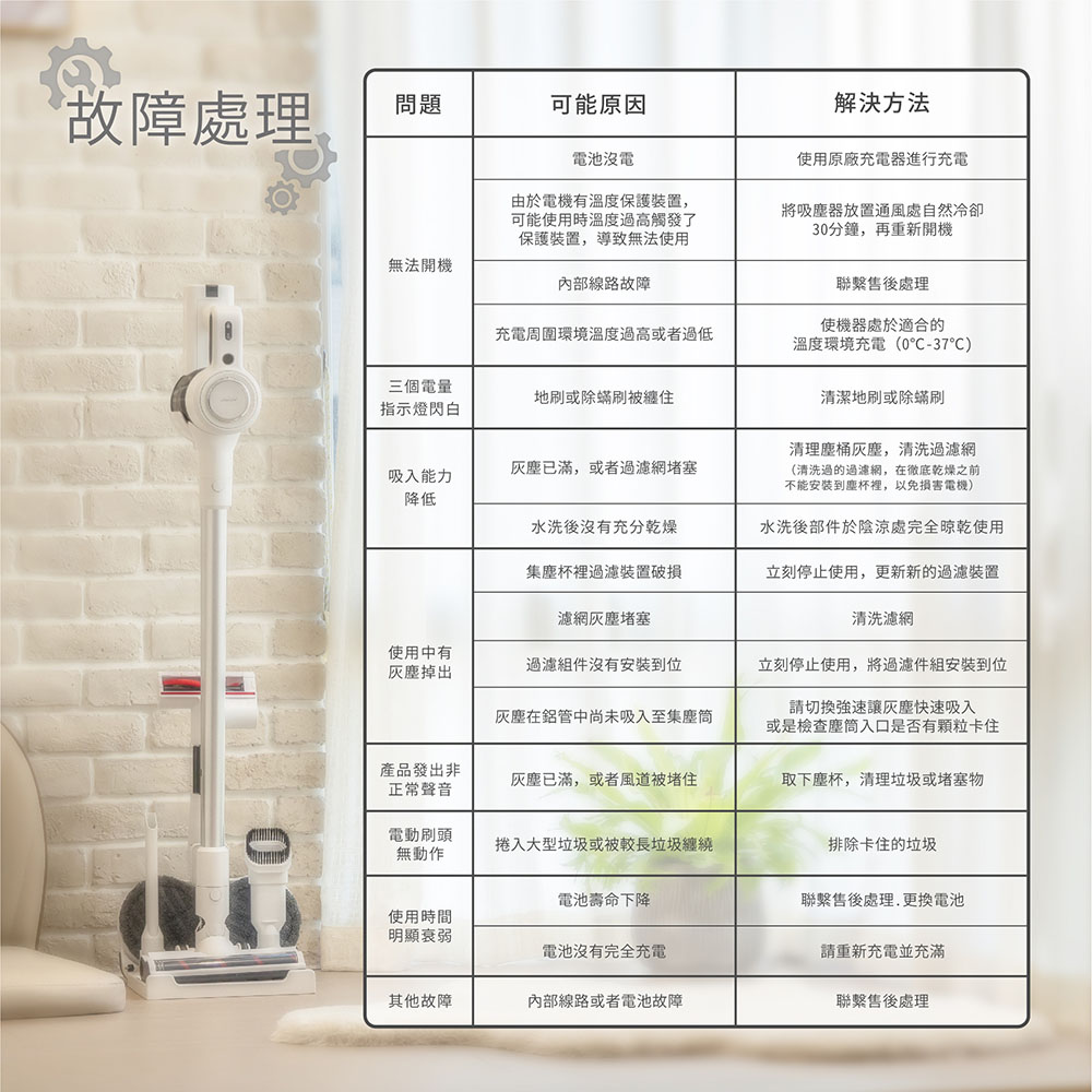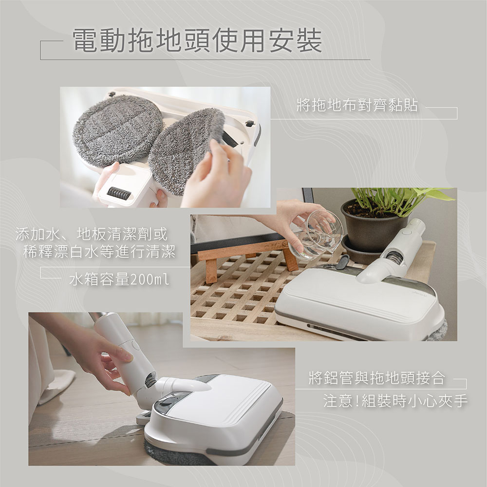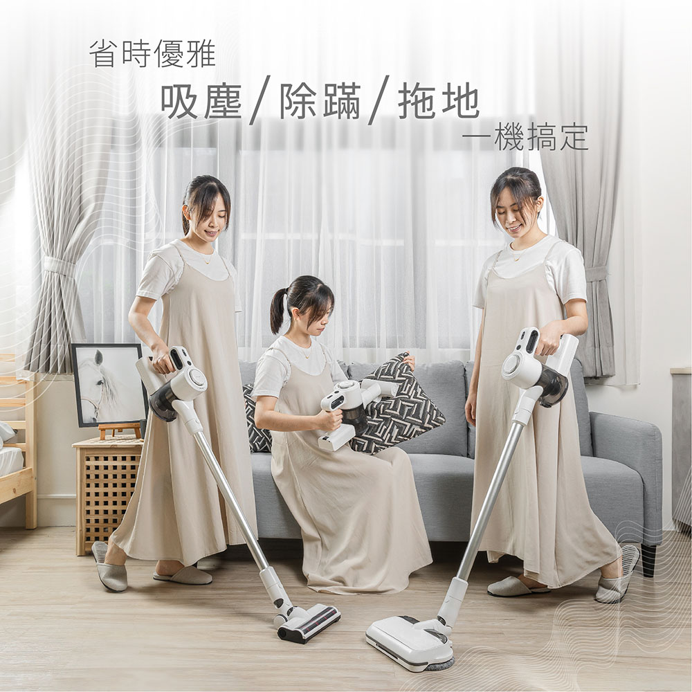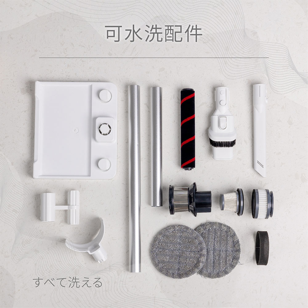 配件:主機、電動地刷吸頭、電動拖地刷、電動塵蹣吸頭、二合一吸頭、長扁吸頭、主機連接鋁管、整機收納架、充電器、說明書、HEPA濾網